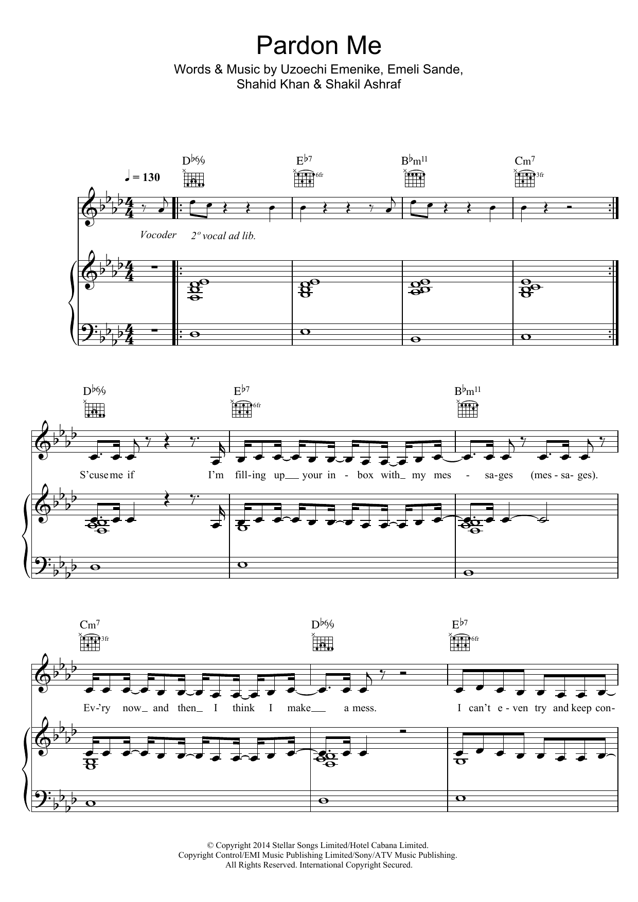 Download or print Naughty Boy Pardon Me (featuring Professor Green, Laura Mvula, Wilkinson and Ava Lily) sheet music, chords and digital score arranged for Piano, Vocal & Guitar Chords. This Pop score includes 7 page(s).