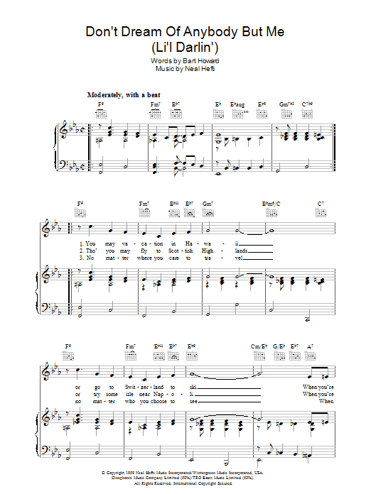 Download or print Neal Hefti Don't Dream Of Anybody But Me (Li'l Darlin') sheet music, chords and digital score arranged for Piano, Vocal & Guitar Chords. This Pop score includes 4 page(s).