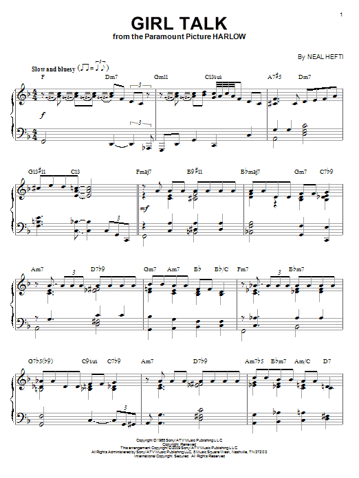 Download or print Neal Hefti Girl Talk (arr. Brent Edstrom) sheet music, chords and digital score arranged for Piano Solo. This Jazz score includes 4 page(s).