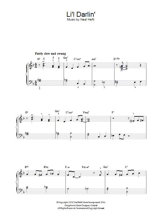Download or print Neal Hefti Li'l Darlin' sheet music, chords and digital score arranged for Piano Solo. This Jazz score includes 3 page(s).