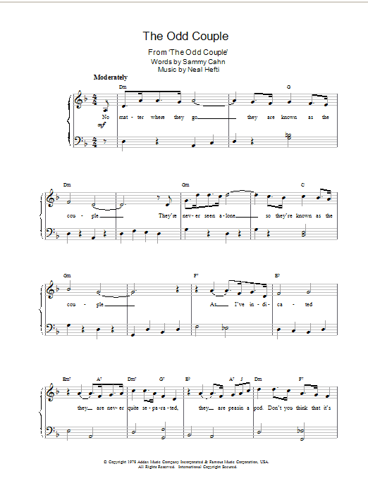 Download or print Neal Hefti The Odd Couple sheet music, chords and digital score arranged for French Horn Solo. This Film/TV score includes 1 page(s).