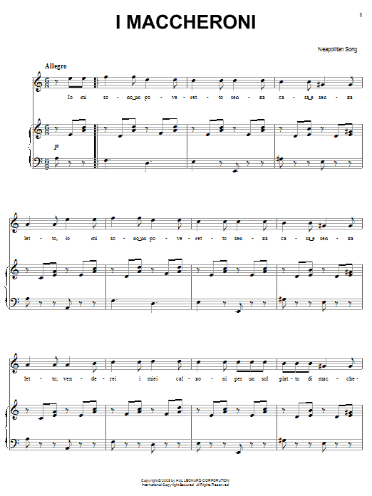 Download or print Neapolitan Song I Maccheroni sheet music, chords and digital score arranged for Piano, Vocal & Guitar Chords (Right-Hand Melody). This Classical score includes 2 page(s).
