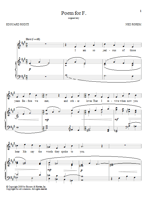 Download or print Ned Rorem Poem For F. sheet music, chords and digital score arranged for Piano & Vocal. This Classical score includes 2 page(s).