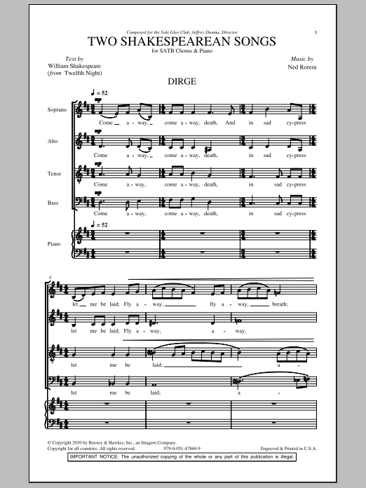 Download or print Ned Rorem Two Shakespearean Songs sheet music, chords and digital score arranged for SATB Choir. This Contemporary score includes 12 page(s).