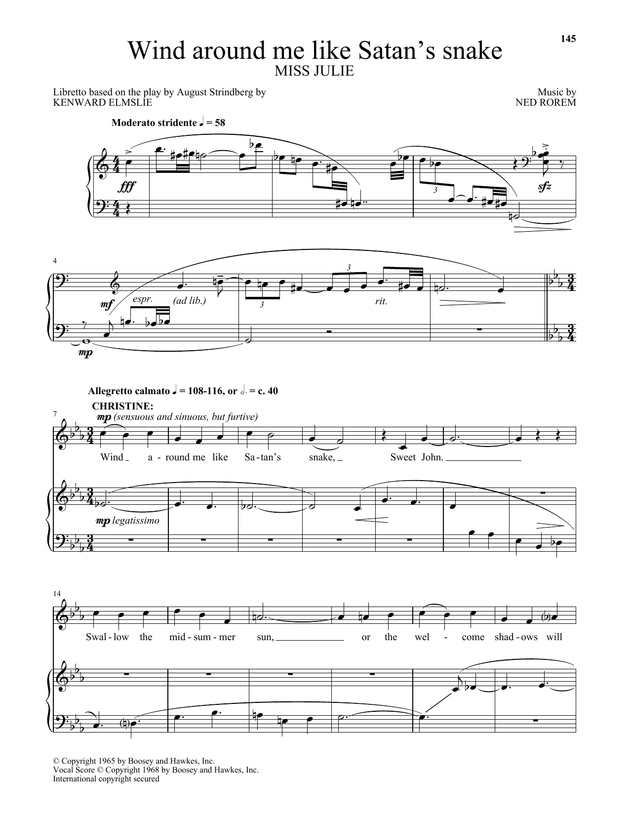 Download or print Ned Rorem Wind around me like Satan's snake (from Miss Julie) sheet music, chords and digital score arranged for Piano & Vocal. This Classical score includes 3 page(s).