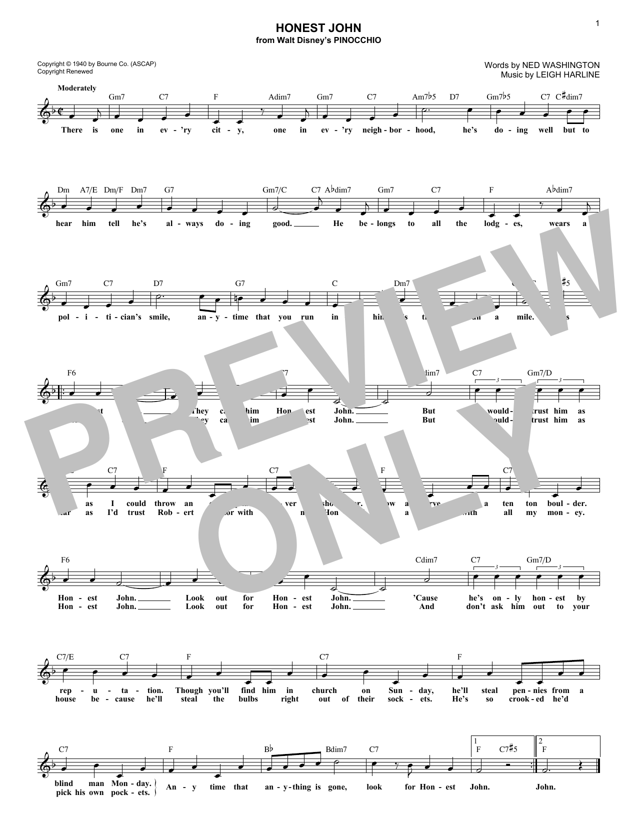 Download or print Ned Washington Honest John sheet music, chords and digital score arranged for Lead Sheet / Fake Book. This Children score includes 1 page(s).