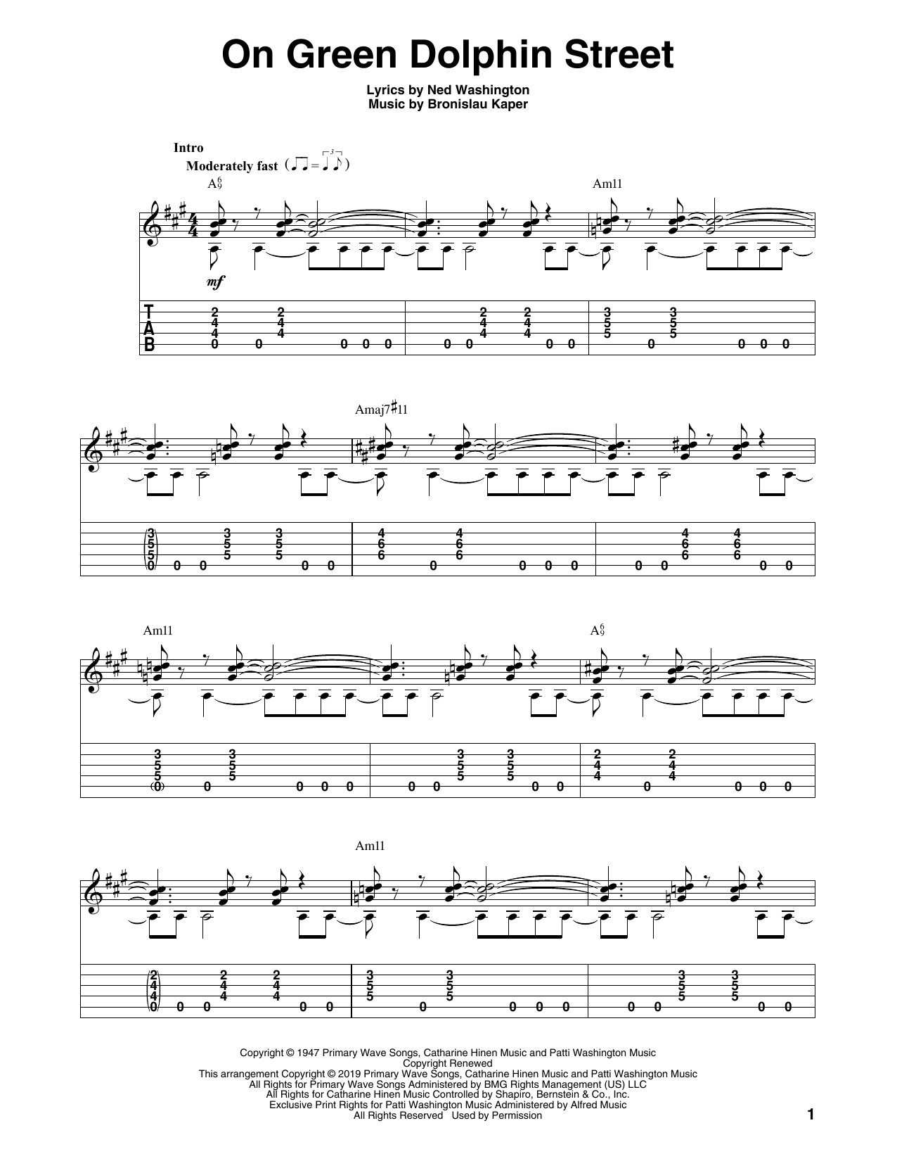 Download or print Ned Washington On Green Dolphin Street (arr. Bill LaFleur) sheet music, chords and digital score arranged for Solo Guitar. This Jazz score includes 8 page(s).