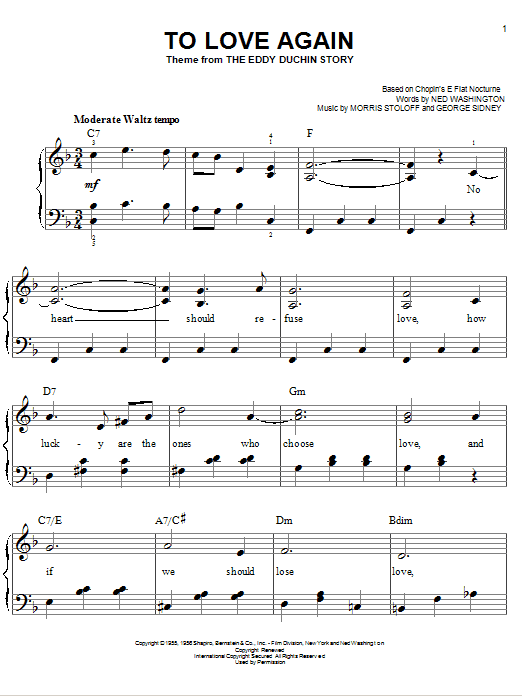 Download or print Ned Washington To Love Again sheet music, chords and digital score arranged for Easy Piano. This Standards score includes 3 page(s).