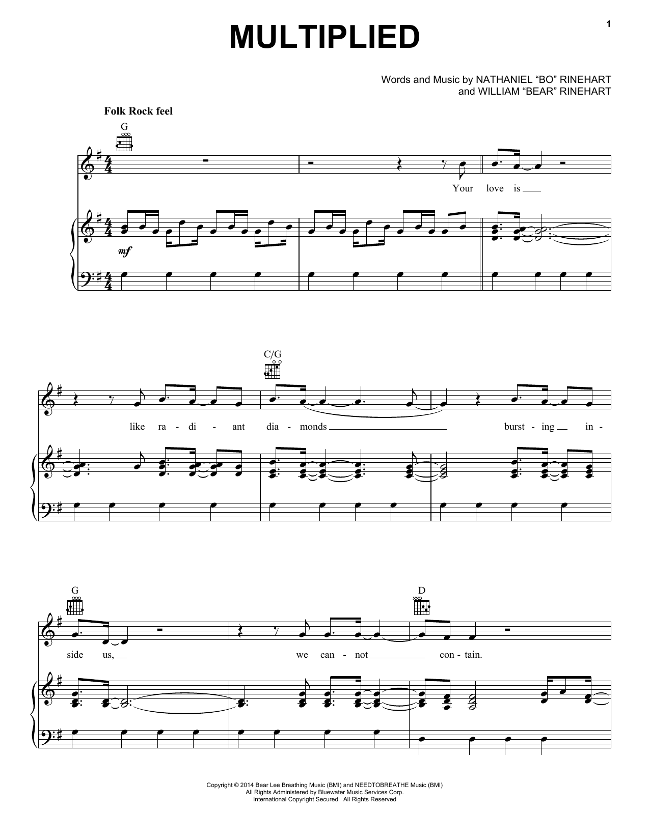 Download or print NEEDTOBREATHE Multiplied sheet music, chords and digital score arranged for Piano, Vocal & Guitar Chords (Right-Hand Melody). This Pop score includes 10 page(s).