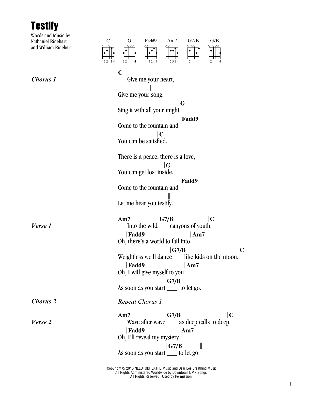 Download or print NEEDTOBREATHE Testify sheet music, chords and digital score arranged for Guitar Chords/Lyrics. This Pop score includes 3 page(s).