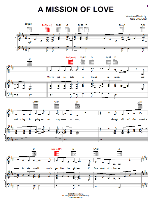 Download or print Neil Diamond A Mission Of Love sheet music, chords and digital score arranged for Piano, Vocal & Guitar Chords (Right-Hand Melody). This Pop score includes 8 page(s).