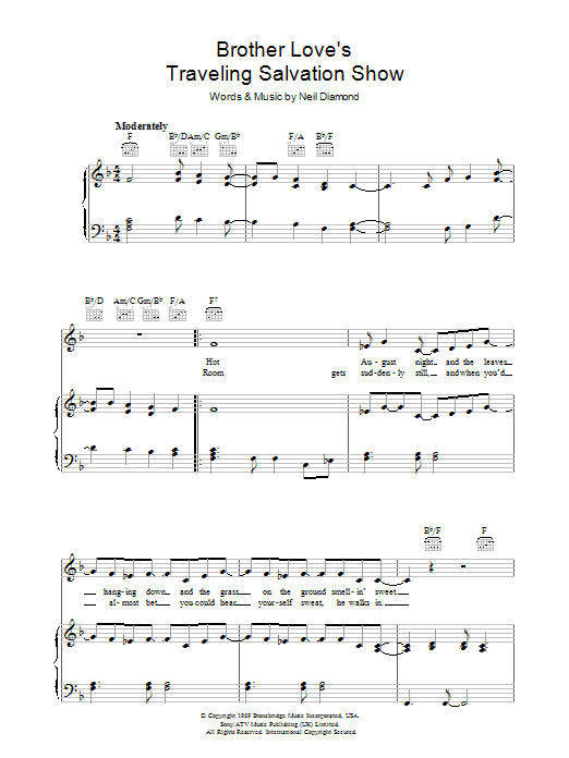Download or print Neil Diamond Brother Love's Travelling Salvation Show sheet music, chords and digital score arranged for Piano, Vocal & Guitar Chords. This Rock score includes 8 page(s).