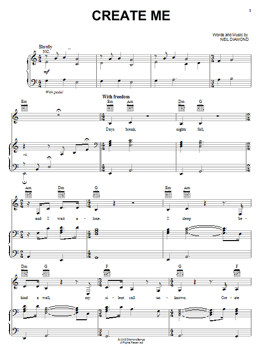 Download or print Neil Diamond Create Me sheet music, chords and digital score arranged for Piano, Vocal & Guitar Chords (Right-Hand Melody). This Pop score includes 5 page(s).
