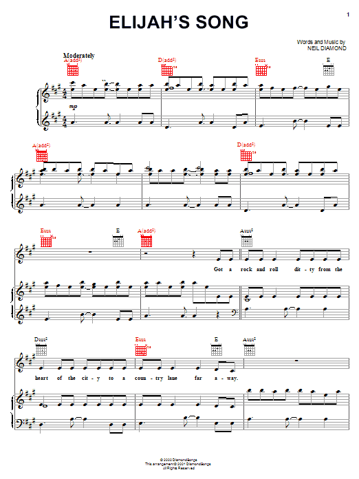 Download or print Neil Diamond Elijah's Song sheet music, chords and digital score arranged for Piano, Vocal & Guitar Chords (Right-Hand Melody). This Pop score includes 5 page(s).