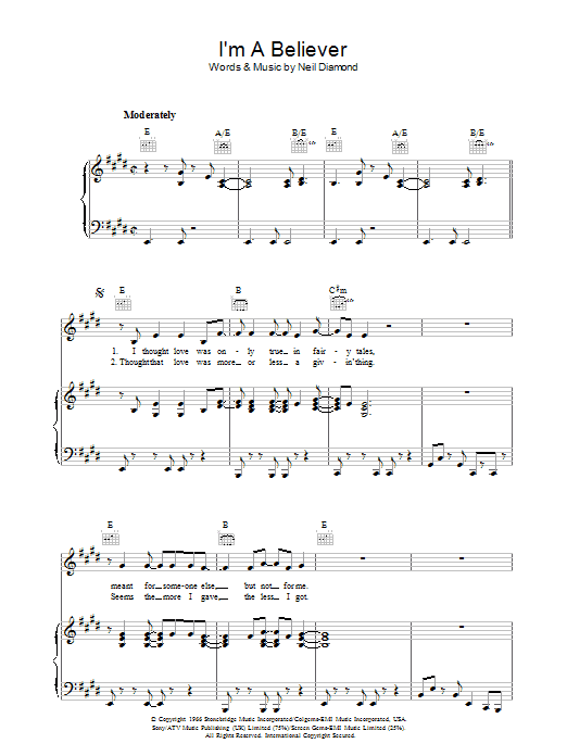 Download or print Neil Diamond I'm A Believer sheet music, chords and digital score arranged for Piano, Vocal & Guitar Chords (Right-Hand Melody). This Pop score includes 4 page(s).