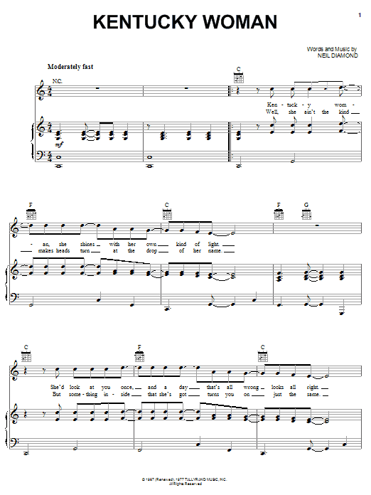 Download or print Neil Diamond Kentucky Woman sheet music, chords and digital score arranged for Easy Piano. This Rock score includes 4 page(s).