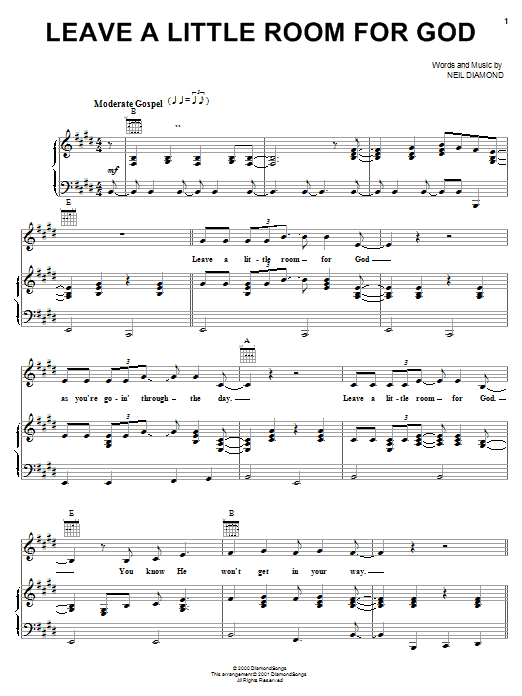 Download or print Neil Diamond Leave A Little Room For God sheet music, chords and digital score arranged for Piano, Vocal & Guitar Chords (Right-Hand Melody). This Pop score includes 4 page(s).