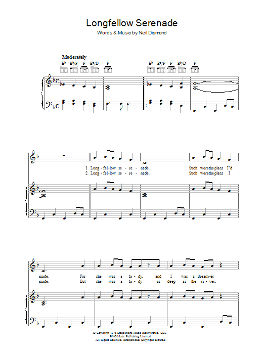Download or print Neil Diamond Longfellow Serenade sheet music, chords and digital score arranged for Easy Piano. This Rock score includes 4 page(s).