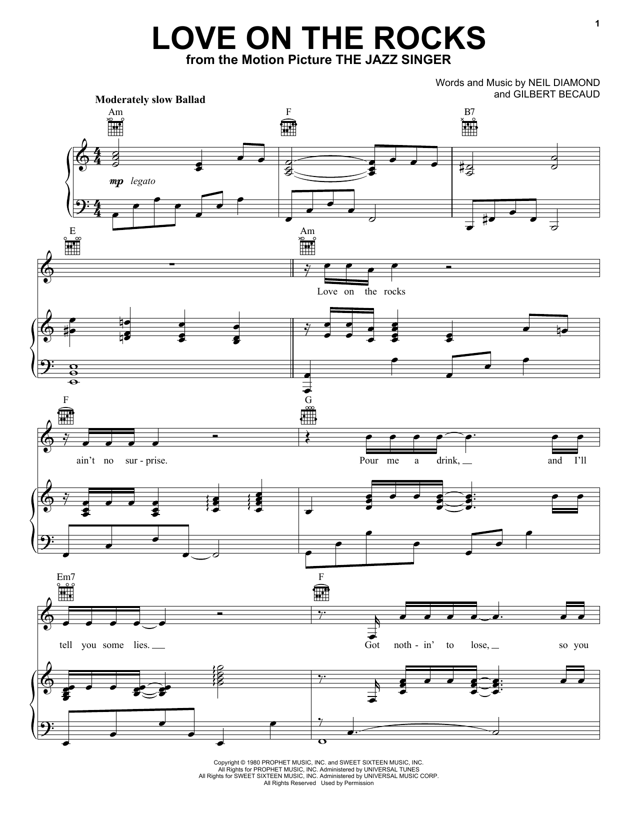Download or print Neil Diamond Love On The Rocks sheet music, chords and digital score arranged for Piano, Vocal & Guitar Chords. This Rock score includes 5 page(s).