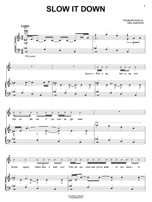 Download or print Neil Diamond Slow It Down sheet music, chords and digital score arranged for Piano, Vocal & Guitar Chords (Right-Hand Melody). This Pop score includes 6 page(s).