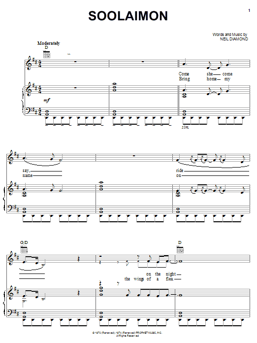 Download or print Neil Diamond Soolaimon sheet music, chords and digital score arranged for Piano, Vocal & Guitar Chords. This Rock score includes 6 page(s).