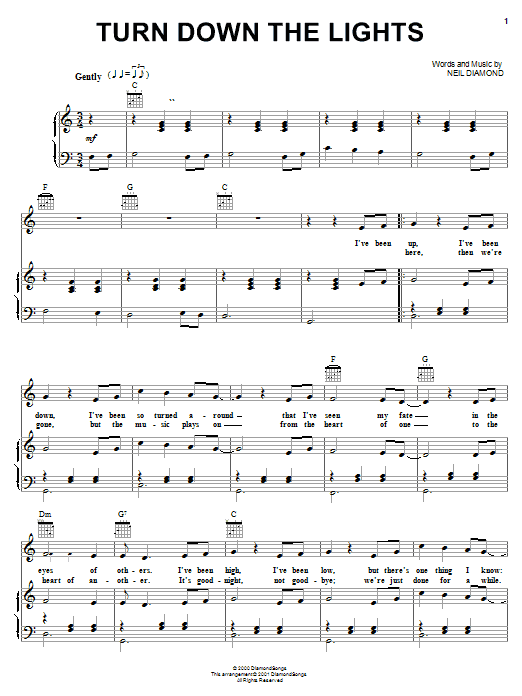 Download or print Neil Diamond Turn Down The Lights sheet music, chords and digital score arranged for Piano, Vocal & Guitar Chords (Right-Hand Melody). This Pop score includes 5 page(s).