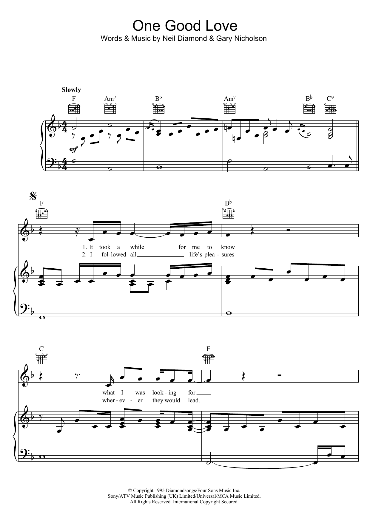 Download or print Neil Diamond & Waylon Jennings One Good Love sheet music, chords and digital score arranged for Piano, Vocal & Guitar Chords. This Country score includes 5 page(s).