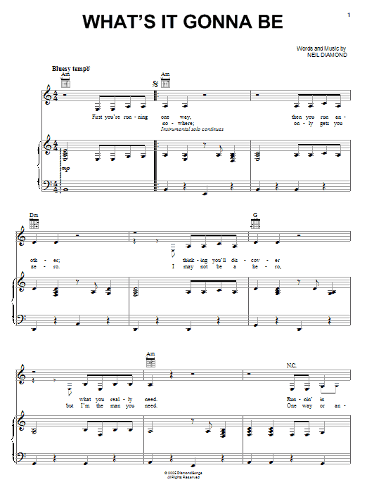 Download or print Neil Diamond What's It Gonna Be sheet music, chords and digital score arranged for Piano, Vocal & Guitar Chords (Right-Hand Melody). This Pop score includes 5 page(s).