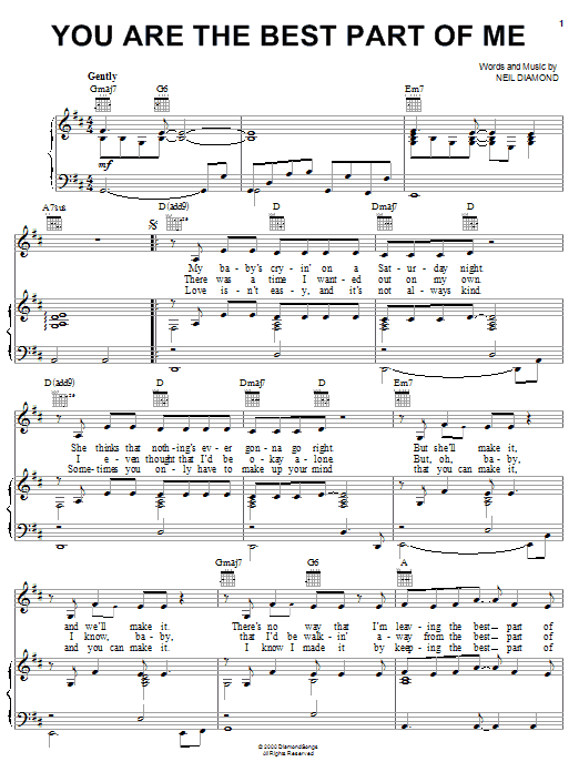 Download or print Neil Diamond You Are The Best Part Of Me sheet music, chords and digital score arranged for Piano, Vocal & Guitar Chords (Right-Hand Melody). This Pop score includes 5 page(s).