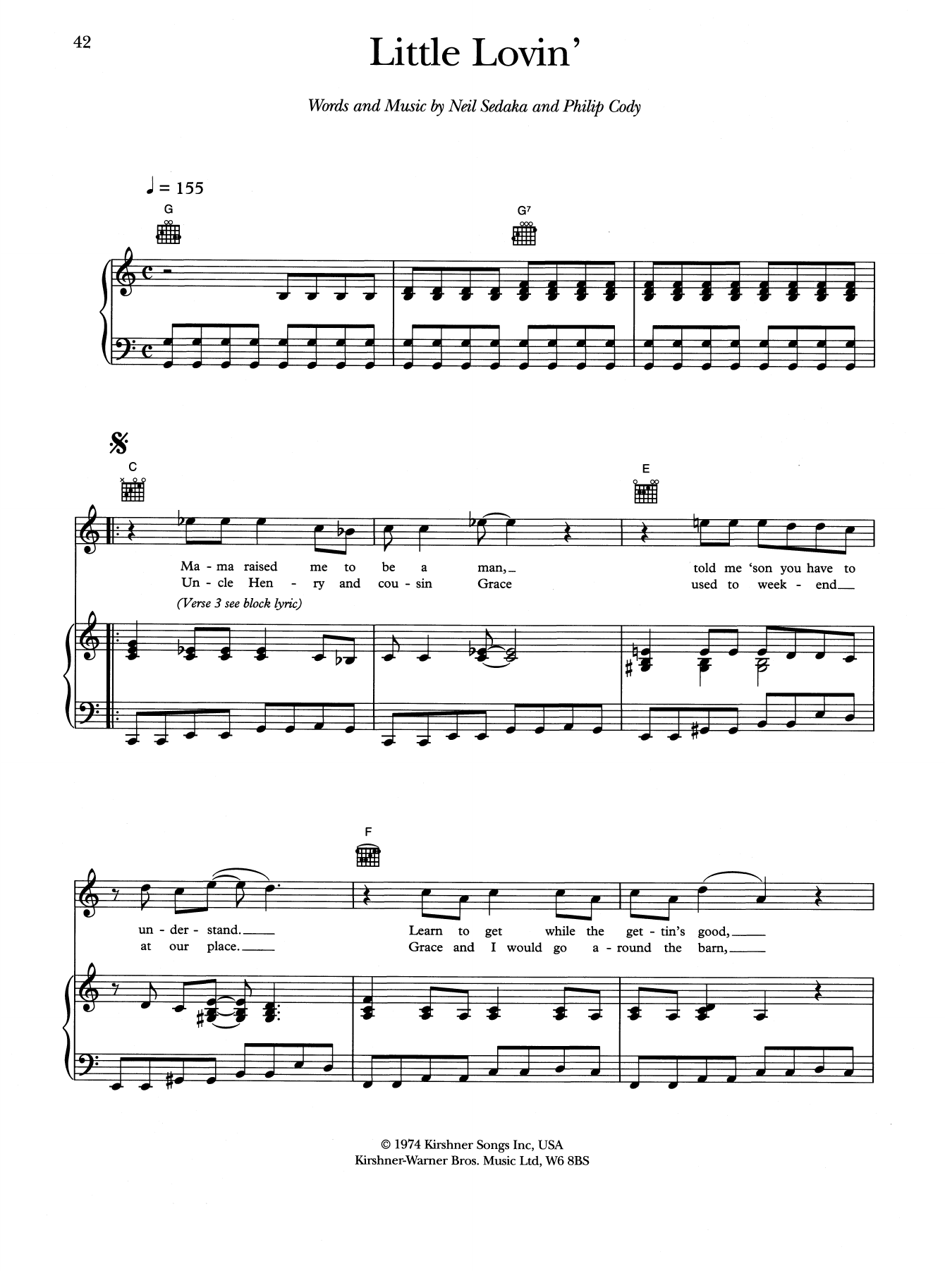 Download or print Neil Sedaka A Little Lovin' sheet music, chords and digital score arranged for Piano, Vocal & Guitar Chords (Right-Hand Melody). This Pop score includes 5 page(s).