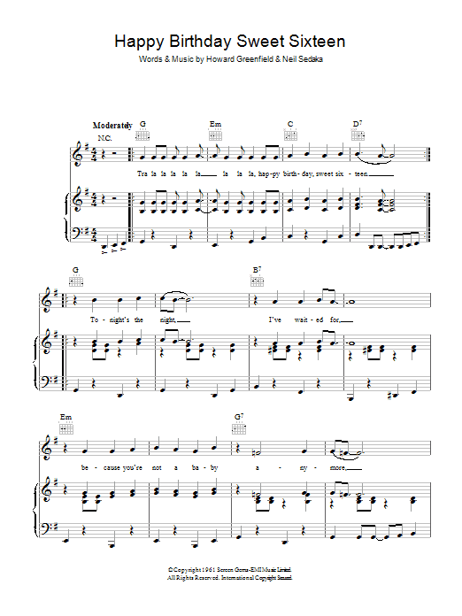 Download or print Neil Sedaka Happy Birthday Sweet Sixteen sheet music, chords and digital score arranged for Lead Sheet / Fake Book. This Pop score includes 1 page(s).