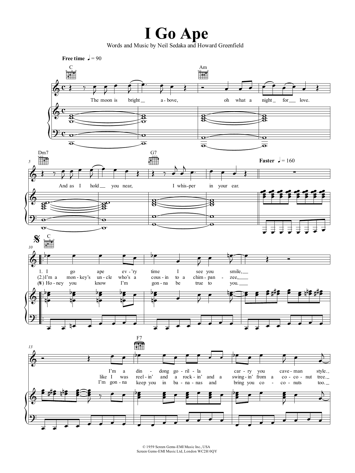 Download or print Neil Sedaka I Go Ape sheet music, chords and digital score arranged for Piano, Vocal & Guitar Chords (Right-Hand Melody). This Pop score includes 4 page(s).