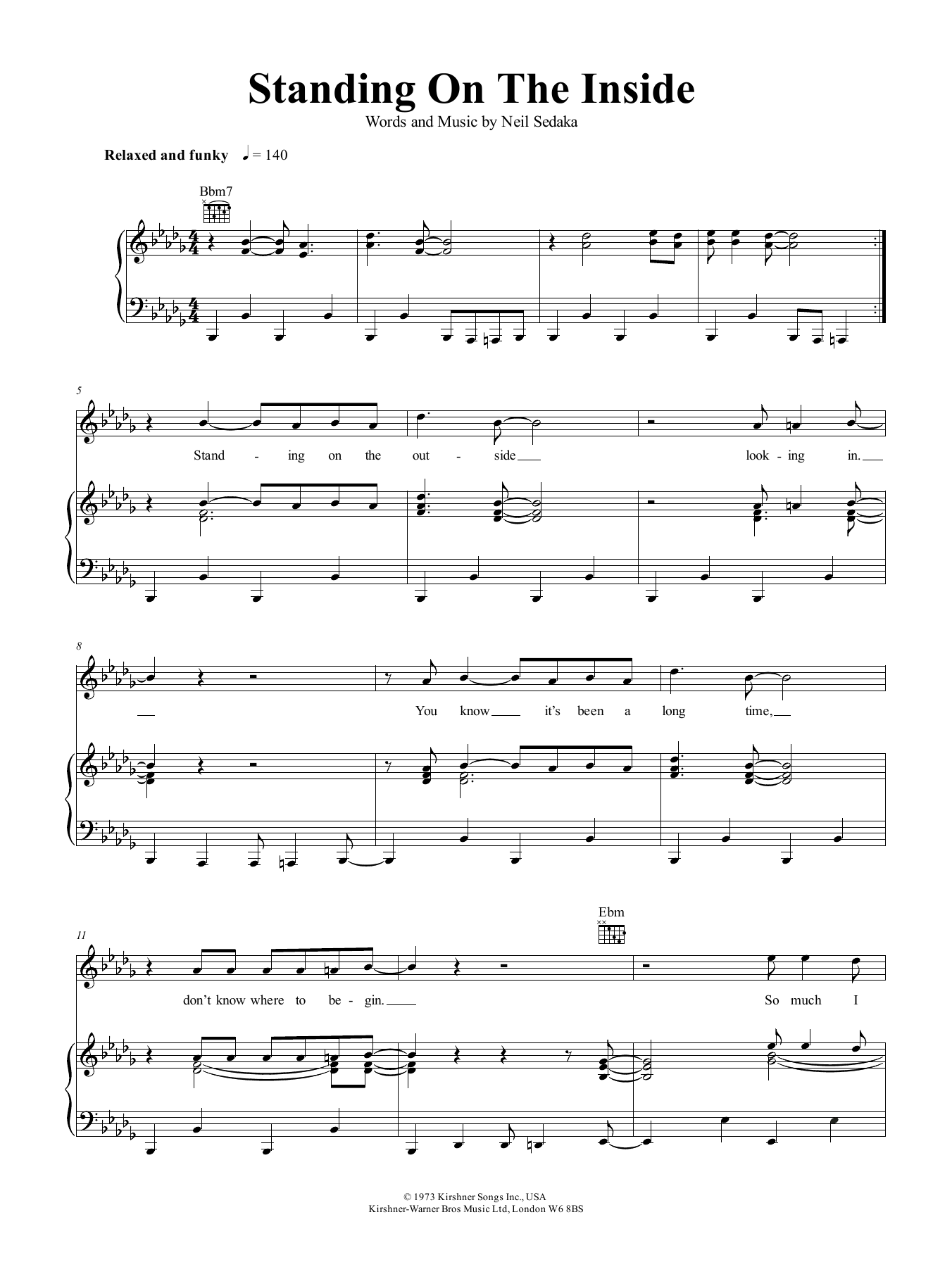 Download or print Neil Sedaka Standing On The Inside sheet music, chords and digital score arranged for Piano, Vocal & Guitar Chords (Right-Hand Melody). This Pop score includes 7 page(s).