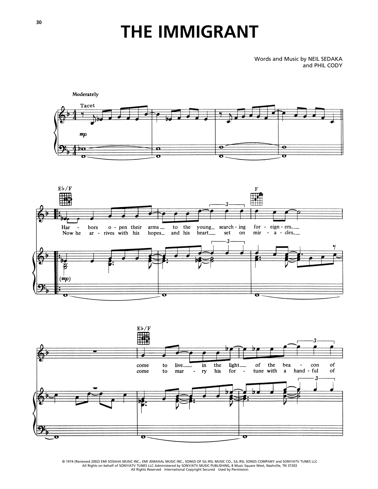 Download or print Neil Sedaka The Immigrant sheet music, chords and digital score arranged for Piano, Vocal & Guitar Chords (Right-Hand Melody). This Pop score includes 4 page(s).