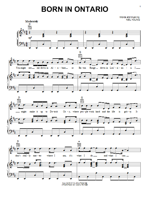 Download or print Neil Young Born In Ontario sheet music, chords and digital score arranged for Piano, Vocal & Guitar Chords (Right-Hand Melody). This Folk score includes 6 page(s).