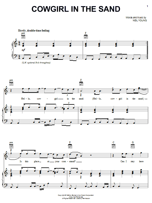Download or print Neil Young Cowgirl In The Sand sheet music, chords and digital score arranged for Easy Piano. This Pop score includes 3 page(s).