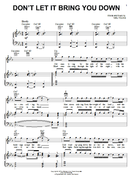 Download or print Neil Young Don't Let It Bring You Down sheet music, chords and digital score arranged for Guitar Tab. This Folk score includes 3 page(s).