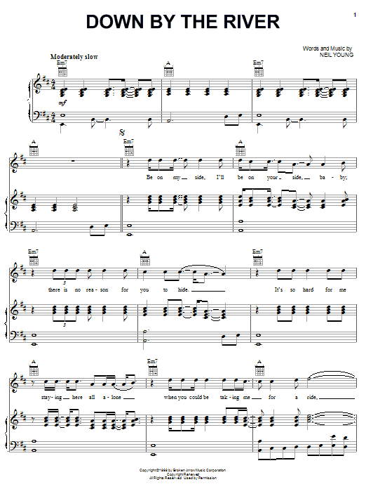 Download or print Neil Young Down By The River sheet music, chords and digital score arranged for Guitar Tab. This Pop score includes 25 page(s).