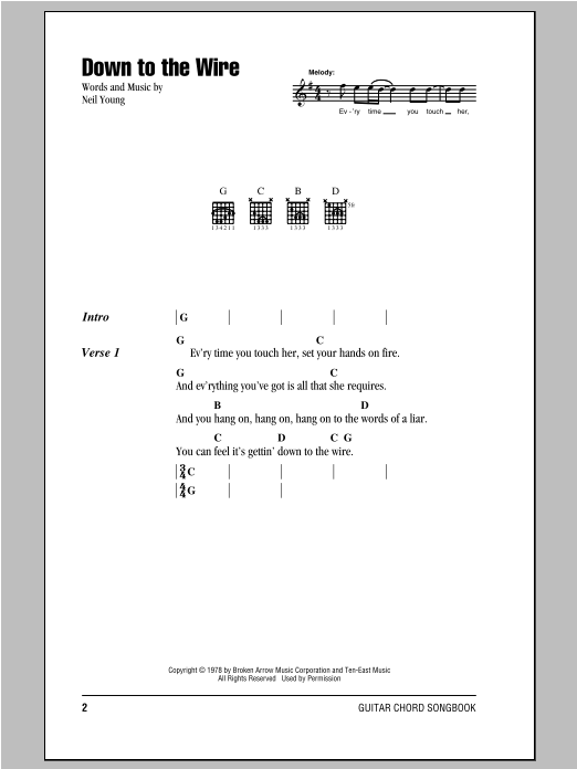 Download or print Neil Young Down To The Wire sheet music, chords and digital score arranged for Guitar Rhythm Tab. This Pop score includes 2 page(s).