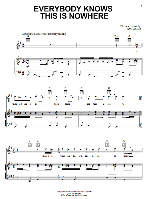 Download or print Neil Young Everybody Knows This Is Nowhere sheet music, chords and digital score arranged for Piano, Vocal & Guitar Chords (Right-Hand Melody). This Pop score includes 4 page(s).