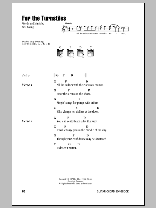 Download or print Neil Young For The Turnstiles sheet music, chords and digital score arranged for Guitar Rhythm Tab. This Pop score includes 4 page(s).