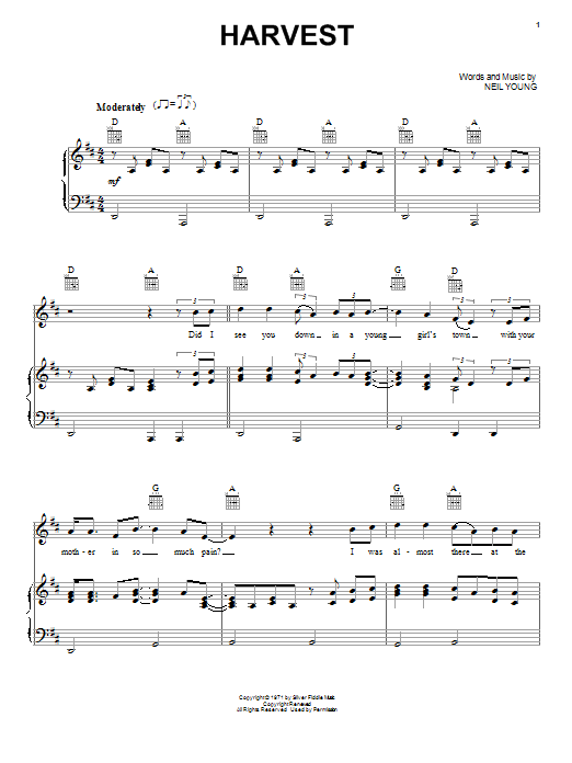 Download or print Neil Young Harvest sheet music, chords and digital score arranged for Piano, Vocal & Guitar Chords (Right-Hand Melody). This Pop score includes 5 page(s).
