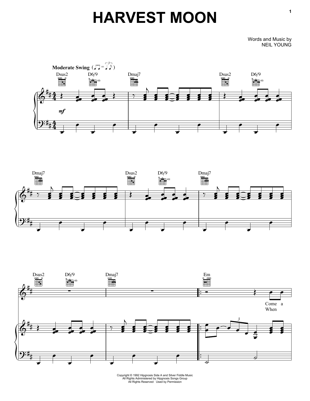 Download or print Neil Young Harvest Moon sheet music, chords and digital score arranged for Guitar Tab (Single Guitar). This Pop score includes 7 page(s).