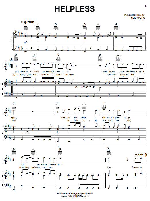 Download or print Neil Young Helpless sheet music, chords and digital score arranged for Solo Guitar. This Pop score includes 4 page(s).