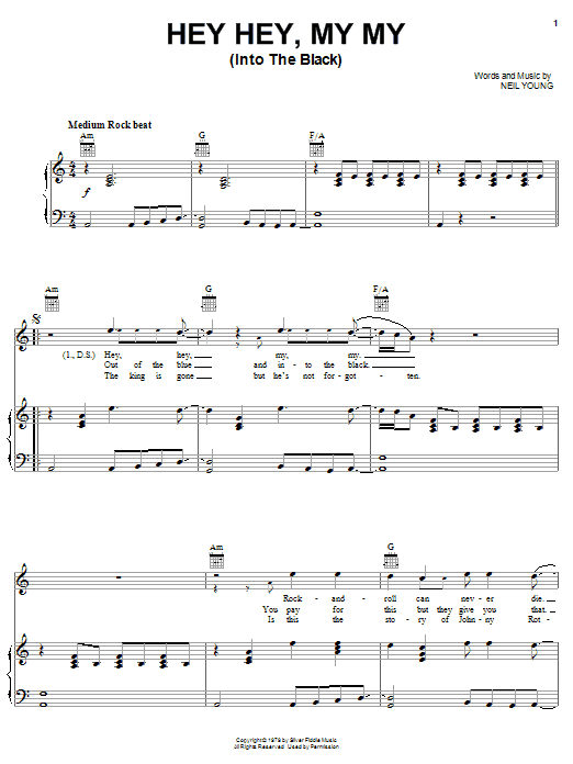 Download or print Neil Young Hey Hey, My My (Into The Black) sheet music, chords and digital score arranged for Solo Guitar. This Pop score includes 3 page(s).