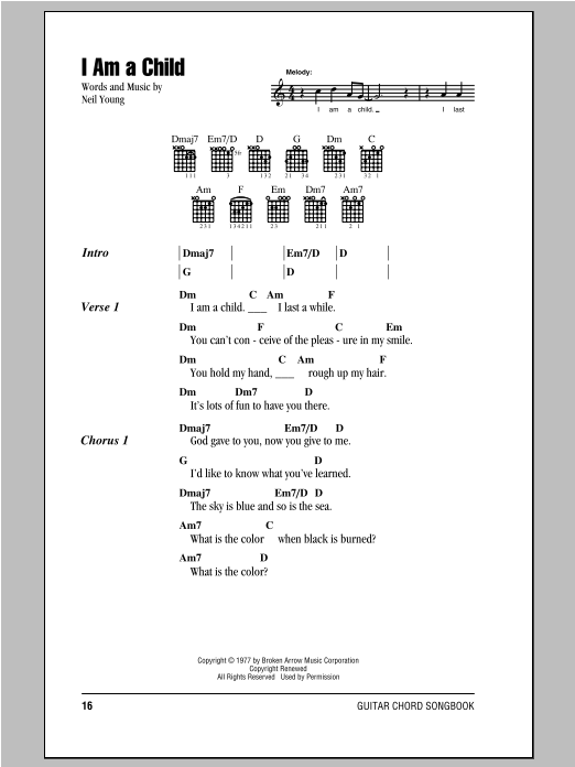 Download or print Neil Young I Am A Child sheet music, chords and digital score arranged for Guitar Rhythm Tab. This Pop score includes 4 page(s).