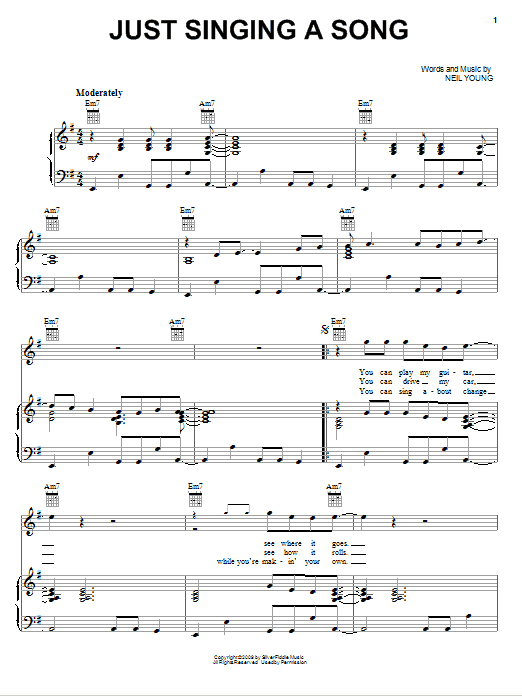 Download or print Neil Young Just Singing A Song sheet music, chords and digital score arranged for Piano, Vocal & Guitar Chords (Right-Hand Melody). This Pop score includes 4 page(s).