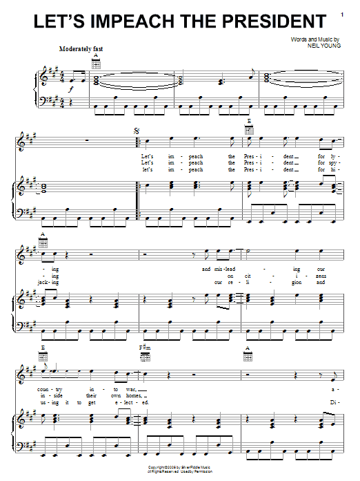 Download or print Neil Young Let's Impeach The President sheet music, chords and digital score arranged for Piano, Vocal & Guitar Chords (Right-Hand Melody). This Pop score includes 6 page(s).
