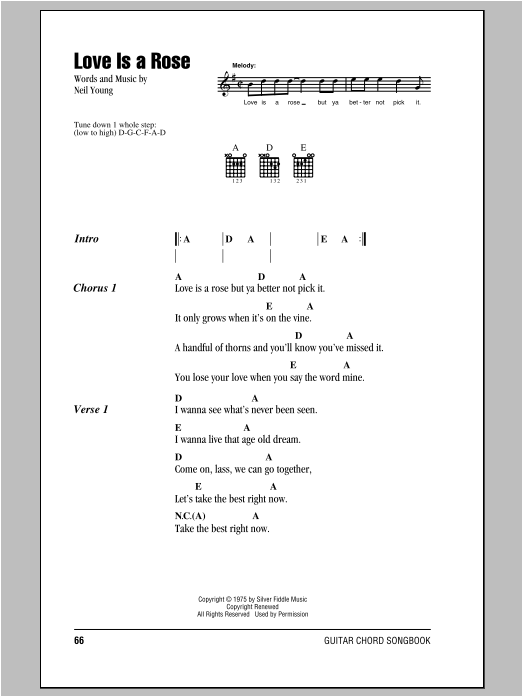 Download or print Neil Young Love Is A Rose sheet music, chords and digital score arranged for Guitar Chords/Lyrics. This Folk score includes 2 page(s).