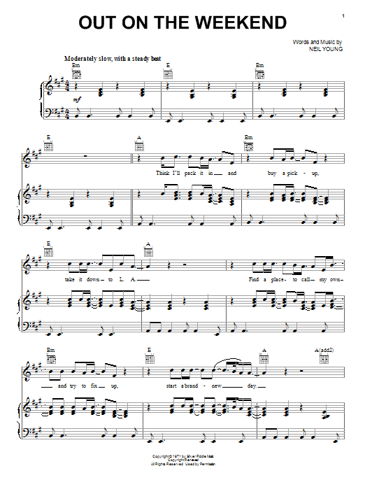 Download or print Neil Young Out On The Weekend sheet music, chords and digital score arranged for Easy Guitar Tab. This Folk score includes 3 page(s).